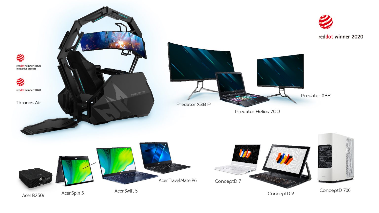 Έντεκα προϊόντα της Acer κέρδισαν συνολικά δώδεκα βραβεία Red Dot Awards 2020, για την τελειότητα και την καινοτομία στη σχεδίαση τους. Η gaming σειρά Predator, με τα notebook, την καρέκλα και τα monitors, συγκέντρωσε τα περισσότερα βραβεία. Η Predator Thronos Air gaming καρέκλα κέρδισε επίσης το Red Dot Innovation Products Award, το οποίο απονέμεται σε προϊόντα που δημιουργούν νέα πρότυπα και θέτουν τις βάσεις για θεμελιώδεις αλλαγές στη βιομηχανία [1]. Τα ConceptD desktop και notebooks για creators πήραν τρία βραβεία, ενώ τα υπόλοιπα πήγαν σε ένα προβολέα και άλλα επαγγελματικά και πολύ λεπτά και ελαφριά notebooks της Acer.