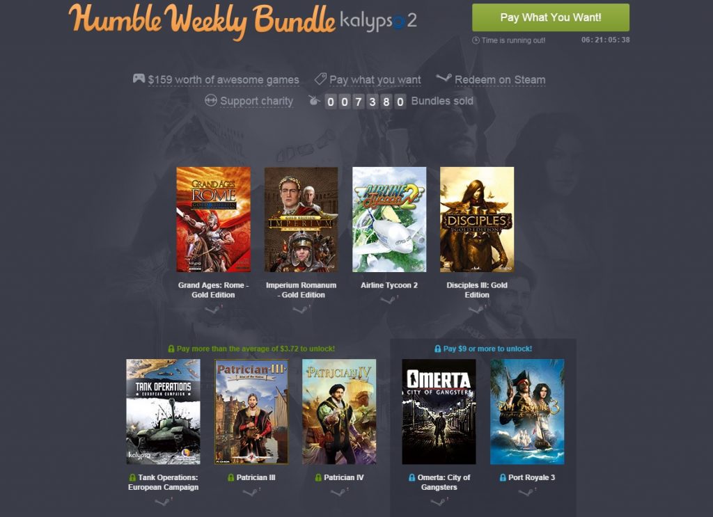 Τα Humble Bundles συνεχίζονται, αυτή την φορά με ένα πακέτο strategy από την Kalypso! To πακέτο λέγεται Kalypso 2, καθώς είναι το δεύτερο πακέτο που διοργανώνει η εταιρεία. Το minimum ποσό που μπορείτε να δώσετε είναι ένα δολάριο (περίπου 75 σεντς του ευρώ δηλαδή μόνο) και σας εξασφαλίζει τα εξής παιχνίδια: Grand Ages: Rome – Gold Edition, Imperium Romanum – Gold Edition, Airline Tycoon 2 και το εξαιρετικό Disciples III: Gold Edition! Καλό θα είναι, αν το αντέχει η τσέπη σας, να δώσετε και κάτι παραπάνω, καθώς τα κέρδη πηγαίνουν κατευθείαν στους developers και σε φιλανθρωπικές οργανώσεις. Μπορείτε εσείς να ορίσετε το ποσοστό που πηγαίνει σε κάθε φορέα.