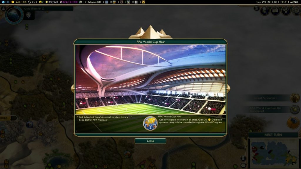 Το mod λέγεται FIFA World Cup Host Resolution: ουσιαστικά κάνει διαθέσιμο έναν εσωτερικό διαγωνισμό ανάμεσα στα έθνη, για το ποιος θα αναλάβει την διοργάνωση του θεσμού! Υπάρχουν δωροδοκίες, ελάχιστες ανταμοιβές για το έθνος που κερδίζει (μόλις 20 Gold), ακόμα και ειδική μονάδα, φτιαγμένη αποκλειστικά για το FIFA mod, τον Migrant Worker (κοστίζει τα μισά από έναν κανονικό Worker!).
