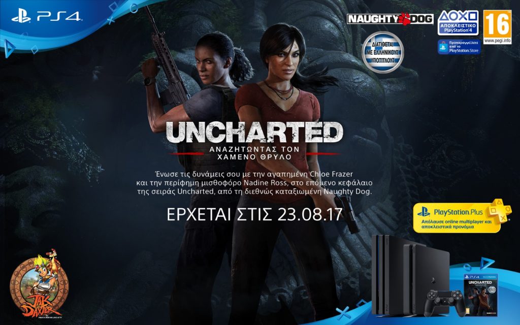 Η αντίστροφη μέτρηση για την επιστροφή του Uncharted, ενός από τους πιο επιτυχημένους αποκλειστικούς τίτλους του PlayStation παγκοσμίως ξεκίνησε! Η νέα συναρπαστική περιπέτεια «Uncharted: Αναζητώντας τον Χαμένο Θρύλο» θα κάνει την εμφάνισή της στα ράφια των καταστημάτων και στο PlayStation Store, στις 23 Αυγούστου 2017 και κάθε προ-παραγγελία θα φέρνει μαζί και ένα δώρο έκπληξη, το αγαπημένο Jak & Daxter.